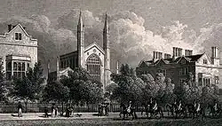 Poynter designed a trio of churches in Cambridge, notable bright red brick buildings: Christ Church, Newmarket Road in 1837–39; the Church of St Andrew the Great on St Andrew's Road in 1842–43, and St Paul's on Hills Road in 1841.[2] St Paul's was the target of criticism from the Cambridge Camden Society, in the first issue (November 1841) of its journal, the Ecclesiologist. While some of the society's members found the attack embarrassing, it was supported by Augustus Pugin.[4] The issue was withdrawn, but an offer then to review another of the Poynter churches was not conciliatory, with St Paul's being called a "cheap church"; in 1843 the Church of St Andrew was called "miserable and meagre".[5]