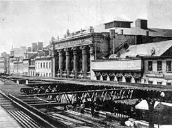 Profits were harder to come by in the 1840s, as more playhouses sprung up in New York. Hamblin staged more effects-driven melodrama and later increased bookings of circus acts, minstrel shows, and other variety entertainments. The Bowery burned down once more in April 1845.[18] This time, Hamblin had fire insurance, and he rebuilt with an eye toward appealing to a more upscale patronage and to staging more spectacular melodrama. The theatre now seated 4,000 and with a stage 126 feet (38 m) square, secured its place as one of the largest playhouses in the world.[5] The architect and builder of the new theatre was John M. Trimble.[19] Hamblin left the management to A. W. Jackson, though Jackson and later managers largely upheld Hamblin's emphasis on melodrama and visual splendor. Hamblin died in January 1853, and the theatre remained in his family until 1867.