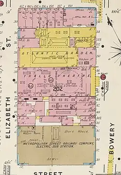 1905 map of the block between Elizabeth (west) & Bowery (east), Bayard (south) and Canal (north), showing the Thalia Theatre just south of large yellow area representing the Atlantic Garden.