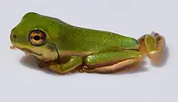 Their dorsum can range in color from the more common bright green to reddish-brown. Their moist skin is ventrally smooth and dorsally granular.[13] Such a range in coloration may result in the frog being mistaken for other species.[2][14] Some evidence suggests that green tree frogs can exhibit a color change in response to their background and/or temperature.[15]