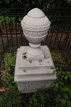 The monument is composed of a urn on a pedestal, both of stone, enclosed by a wrought iron fence. The original monument was marble, enhanced by the additional of a marble urn a few years later, around the time that the Pollock family sold the property to Cornelia Verplanck.[3] The monument has been replaced twice due to deterioration, first in by the city in 1897, also in marble, and then in 1967, in granite.[1]
