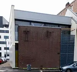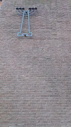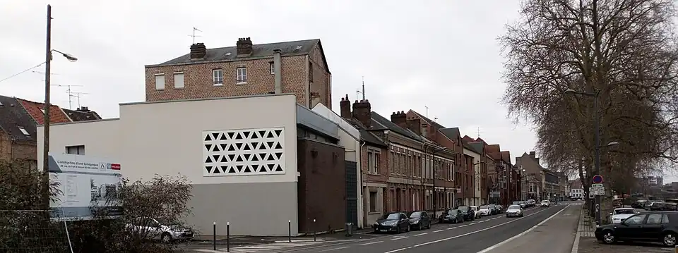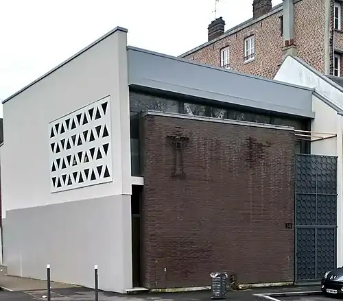 The new Modernist Amiens Synagogue is the work of Paul Chemetov, who was influenced by the Bauhaus style.[5] It is constructed according to a Parallelepipedic plan. The facade, overlooking the Port d'Amont, is understated, decorated only with a Menorah. The sides of the building have mashrabiya openings that resemble Stars of David.[6] A side door with the Tablets of Stone leads to the ground floor, where the sanctuary is located. On the south wall is a commemorative plaque inscribed with the names of those lost from Amiens during the Shoah. Upper floors in the building include a meeting room and other bedrooms.