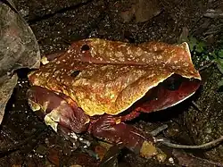 The African giant toad is a large species with a robust body which is a broad ovoid in shape. It has a short snout, an unridged crown and nearly-vertical sides to the head. The eyes are set close together and the upper eyelid has a pointed edge drawn out into a triangular projection. The tympanum is indistinct but the parotid glands are large. The first finger of the hand is longer than the second one, males having nuptial pads on the first two fingers. On the hind limbs, the toes are short and partially webbed. The skin on the back is either smooth or may bear small warts. The upper surface of the head and body is pale brown, yellowish or pinkish. There is a backwards-pointing V-shaped black mark between the eyes and there are sometimes one or more pairs of dark spots on the back. There is sometimes a thin, pale stripe running along the spine. The sides of the head and body are considerably darker than the upper parts. The underparts are grey speckled with white and there is a thin white line bordering the lower jaw. The limbs are barred with dark bands on a greyish or brownish background and the back of the thigh, and sometimes the flanks, are bright red.[6] The combined effect of this colouration is to make the frog resemble a dead leaf and it is well camouflaged when among the leaf litter on the forest floor.[7] The new species differs from the two subspecies in that the posterior part of the abdomen is a darker colour, the line along the spine is dark and the eyelid processes are less-pointed. It is also distinguished genetically from them. There is a 2.2 to 2.8% variation in the 16S rRNA gene, the gene used for investigation, between it and the two subspecies whereas the subspecies are genetically more similar to each other (0.9 to 1.1%) than either of them is to the new species (A. channingi).[4] A. s. chevalieri is the largest subspecies with adult males having an average snout-to-vent length of 127 mm (5.0 in) while A. s. superciliaris averages 121 mm (4.8 in). The new species is shorter again at 109 mm (4.3 in). Females are rather larger than males.[4]