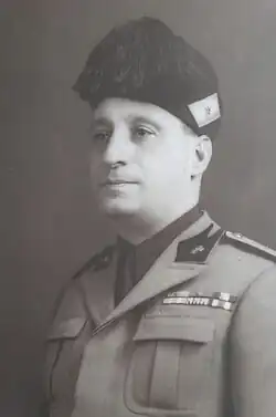 Having joined the National Fascist Party in 1923, in the early 1920s he was chosen by the government as a member of the Jurisdictional Commission for the assets of former enemies.[9] On 2 March 1925 he was appointed president of the regency of the National Veterans Association, of which he later became president from 1927 to 1943.[10][11][12] In the same year he was among the promoters and founders of the Gold Medals Group of the Nastro Azzurro Institute (an association among the recipients of awards for military valor), of which he would later become national president.[13][14] From 1927 to 1928 he was federal secretary of the National Fascist Party of Terni, on 20 April 1929 he became a member of the Italian Chamber of Deputies and on 23 March 1939 of the Chamber of Fasces and Corporations.[15][16][17]