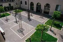 In 2018, Gulgee's installations 7 and 7.7 were shown in Rome. 7 was installed in the open courtyard of the Galleria Comunale d'Arte Moderna, transforming the monastic space into a sculptural char bagh.[15] Its various pieces were formed from one Quranic āyah deconstructed into seven parts. Concurrently, Gulgee showed 7.7 at the Mattatoio di Roma (a former slaughterhouse).[16] Whilst the component objects were interrelated as part of the same series, 7, the installations themselves were almost antithetical. The darkness of Mattatoio was in contrast to the bright outdoor space of the Galleria d'Arte Moderna.