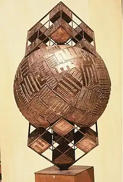 Gulgee's sculpture has spanned over three decades to date. His interest in form has gravitated towards both the organic and geometric.[5] Within the geometric, he primarily works with the cube and the sphere. In two series, Char Bagh (2003 onwards) and Cosmic Chapati (2011–13), he has tried to reconcile the circle/sphere and the square/cube.[4][11] A Char Bagh is an Islamic garden designed to a quadripartite plan: two lines intersect at a perpendicular, and one is able to draw a circle or a square around the edges. In these sculptures, he juxtaposed the sphere and the cube in quarters. In the Cosmic Chapati series, the round chapatis are formed by concentric circles of copper wire, creating and dividing the space within a cube.