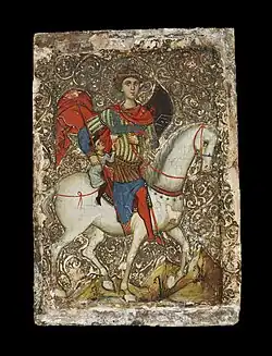 According to the Greek text of the posthumous miracles of Saint George, Amiras was a young Christian boy from the city of Mytilene. He was taken from his family and forced to serve as a Muslim princes cupbearer on the island of Crete. Amiras prayed to Saint George to save him and a year later the Saint appeared on his white horse, rescuing the boy while he was serving wine to the prince and carried him across the Aegean Sea back to his mother.[1][2][3]
