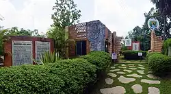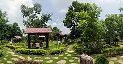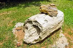 Amkhoi Fossil Park is a fossil park located near Illambazar in the Birbhum District of West Bengal, India. It contains fossilized wood 15 to 20 million years of age and is officially recognized by the State Forest Department of West Bengal.[1] In 2016 while digging a pond the villagers of Amkhoi village, near Ilambazar, found some large bone-like structures. Later it was established that the bone-like structures were actually wood fossils. Fossilized or petrified wood is often considered as semi-precious ‘stones’ and often used in jewellery — fetching a good market value.[2] As the word spread it attracted fossil hunters from far and wide. To prevent the vandalism and theft of fossils the forest department decided to convert the area into a fossil park.[3] In 2017 - 18 the park came into existence and was called Amkhoi Wood Fossil Park. The aim of the park was to create awareness about fossils among students and common people, and also try to help scholars in their research.[2] It is the only fossil park of West Bengal state and has an area of 10 hectares.[4] The fossils are laid out in a manicured lawn surrounded by pathways separated by hedge walls. Bilingual boards narrate the details of not only the fossils, but also about the process of fossilization.[2]