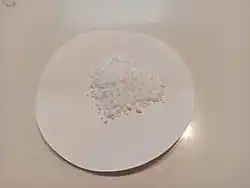 Ammonium bicarbonate is used in the food industry as a leavening agent for flat baked goods, such as cookies and crackers. It was commonly used in the home before modern-day baking powder was made available. Many baking cookbooks, especially from Scandinavian countries, may still refer to it as hartshorn or hornsalt,[4][5] while it is known as "hirvensarvisuola" in Finnish, "hjortetakksalt" or "hornsalt" in Norwegian, "hjortetakssalt" in Danish, "hjorthornssalt" in Swedish, and "Hirschhornsalz" in German (lit., "salt of hart's horn"). Although there is a slight smell of ammonia during baking, this quickly dissipates, leaving no taste. It is used in, for example, Swedish "drömmar" biscuits and Danish "klejner" Christmas biscuits, and German Lebkuchen. In many cases it may be replaced with baking soda or baking powder, or a combination of both, depending on the recipe composition and leavening requirements.[6] Compared to baking soda or potash, hartshorn has the advantage of producing more gas for the same amount of agent, and of not leaving any salty or soapy taste in the finished product, as it completely decomposes into water and gaseous products that evaporate during baking. It cannot be used for moist, bulky baked goods however, such as normal bread or cakes, since some ammonia will be trapped inside and will cause an unpleasant taste. It has been assigned E number E503 for use as a food additive in the European Union.
