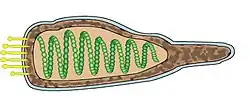 Ampullaviruses have unique morphology, with the virions being bottle-shaped with one narrow end that smoothly expands into a wider end for an overall length of about 230 nm and width of about 75 nm at the broad end. The narrow end projects beyond the viral envelope and is likely used to inject the viral DNA into host cells. The broad end possesses about 20 thin filaments, each that are regularly distributed in a ring. Inside the envelope is a funnel-shaped protein coat that houses the viral DNA.[3]The genome of ampullaviruses is linear, double-stranded DNA that is about 23.8 kilobases in length. The genome contains an estimated 56 or 57 open reading frames that encode for at least six structural proteins.[3][5]