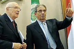 Amr Muhammad Moussa (Arabic: عمرو محمد موسى, IPA: [ˈʕɑmɾe mæˈħæmmæd ˈmuːsæ]; born 3 October 1936) is an Egyptian politician and diplomat who was the Secretary-General of the Arab League, a 22-member forum representing Arab states, from 1 June 2001 to 1 July 2011. Previously he served in the government of Egypt as Minister of Foreign Affairs from 1991 to 2001. On 8 September 2013, he was elected president of the committee of 50 that will amend the Egyptian constitution.[2]