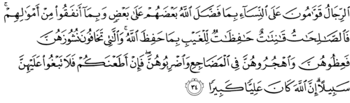 ٱلرِّجَالُ قَوَّٰمُونَ عَلَى ٱلنِّسَآءِ بِمَا فَضَّلَ ٱللَّهُ بَعْضَهُمْ عَلَىٰ بَعْضٍۢ وَبِمَآ أَنفَقُوا۟ مِنْ أَمْوَٰلِهِمْ ۚ فَٱلصَّـٰلِحَـٰتُ قَـٰنِتَـٰتٌ حَـٰفِظَـٰتٌۭ لِّلْغَيْبِ بِمَا حَفِظَ ٱللَّهُ ۚ وَٱلَّـٰتِى تَخَافُونَ نُشُوزَهُنَّ فَعِظُوهُنَّ وَٱهْجُرُوهُنَّ فِى ٱلْمَضَاجِعِ وَٱضْرِبُوهُنَّ ۖ فَإِنْ أَطَعْنَكُمْ فَلَا تَبْغُوا۟ عَلَيْهِنَّ سَبِيلًا ۗ إِنَّ ٱللَّهَ كَانَ عَلِيًّۭا كَبِيرًۭا