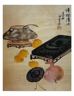 During the 1890s and 1900s, there was an influx of Japanese artists establishing schools in Korea to teach the Japanese painting style nihonga ("Japanese-style paintings"). An was inspired by their technique, thus leading him to open up his own private atelier and teach young, prospering Korean painters.[1] An's private studio was called Gyeongmukdang (경묵당, also referred to as Gyeongmukheon 경묵헌; Gyeongmuk 耕墨 means “cultivating the ink”). He established this studio in 1901 after he returned from his exile in Japan. Gyeongmukdang was established in his sarangbang (which translates to ‘love room’) but is defined as “the study and social area in a Korean traditional house where male scholars worked and received guests”.[5] An's private studio has been credited by art historians as being one of the most influential places to get an education on modern ink-wash painting. Besides an educational site, Gyeongmukdang was a social space where important figures would gather and appreciate the ‘traditional three arts’: poetry, calligraphy and painting.[5] The Kyŏngsong School of Calligraphy and Painting (Gyeongseong-seohwa-misulwon 경성서화미술원 京城書畵美術院), one of the main paintings schools in Korea during the 1900s, took on Gyeongmukdang as an apprenticeship. Although Gyeongmukdang opened in 1901, An could not have begun teaching full-time until at least 1907 because of the political positions he held from 1902 to 1907.[5]