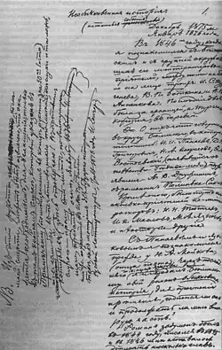 Part 2, pages 51–53, dated July 1878, had another note attached to it: "I've sealed the previous fifty pages in an envelope as finished. But in the course of the last 2.5 years lots of things have happened related to this case and I see that, having once started, I need to continue..." There is an inscription on the envelope: "These papers which have to do with me personally, I commit to Sophia Aleksandrovna Nikitenko for her to deal with them as I asked her to. Ivan Goncharov, May 19, 1883".[2]