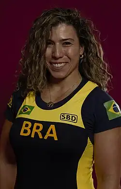 In 2014, he starts the first semester with a gold medal in the Brazilian championship in the city of Itu in São Paulo and ends the semester with a silver medal in the world championship in the city of Potchefstroom in South Africa, he manages to finish his bachelor's degree in the same semester in Physical Education.[14][15] The second semester starts with a gold medal in the South American championship in the city of Guayaquil in Ecuador and ends the semester with a silver medal in Colorado in the United States. At the end of the year, the athlete decides to move from Blumenau to Garopaba to seek new job opportunities in her area of academic training and intensify her training. In 2015, she started the year with a serious car accident.[16] She returned to competitions only on September 16, 2015, at the Pan-American in the city of Ribeirão Preto in the State of São Paulo, winning two gold medals, in raw and equipped, and breaking a record. On November 9, she won a silver medal at the 2015 World Powerlifting Championships in Luxembourg.[17] In 2016, his main international achievements were two gold medals at world championships in the United States in the cities of Killeen and Orlando. And a magnificent gold in the Brazilian championship in the city of Curitiba in the State of Paraná, beating all the records of the competition. In 2017, a flurry of gold medals: Brazilian equipped championship in Santo André, Brazilian raw championship in Ribeirão Preto, South American raw championship in Buenos Aires and world games in Wrocław. And a silver medal at the world championships in Minsk.[18]