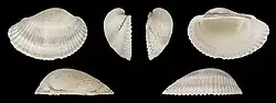 Shells of Anadara diluvii can reach a size of 10–45 millimetres (0.39–1.77 in).[2] The two valves are symmetrical to each other, but the sides are asymmetrical. The shell have about 30-35 ribs. The inner edge is strongly serrated.[3]