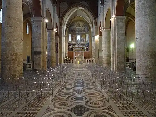 The church was built in a Romanesque-style during 1072-1104 patronized by the Byzantine emperor Michele VII Ducas.[1] Agnani served as the summer residence of the Popes in the 12th and 13th centuries. Bernard of Clairvaux (1174) and Clare of Assisi (1255) were canonized at the cathedral.[2] Frederick Barbarossa was excommunicated here in 1160 by Pope Alexander III.[3]