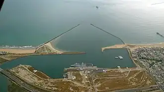 The bay is divided into an outer and inner deep water harbor. The triangular, 94-acre (38 ha) outer harbor is man-made, protected by two converging rubble breakwaters and maintained to a depth of 43 feet (13 m).[1] The west breakwater has a length of 3,500 feet (1,100 m) and the east breakwater is 3,950 feet (1,200 m).[2] The 96 acres (39 ha) inner harbor is natural but dredged to maintain a minimum depth of 13 feet (4.0 m).[1] The two harbors are connected by a channel 436 feet (133 m) wide and 43 feet (13 m) deep.[1][3]