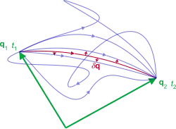 As the system evolves, q traces a path through configuration space (only some are shown). The path taken by the system (red) has a stationary action (δS = 0) under small changes in the configuration of the system (δq).[9]