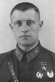 Almost immediately after deploying to the warfront in June 1941 to combat the German invasion of the Soviet Union he gained his first aerial victory, shooting down a PZL.23 while piloting a MiG-3. He continued to tally more aerial victories, including the aerial ramming of a Bf 109 on 7 July 1941 before switching to the Yak-7 shortly thereafter. Having been awarded the title Hero of the Soviet Union on 27 March 1942 for his victories at the start of the war, he was able to quickly rise up through the ranks of the air force, becoming commander of his regiment in July 1942 . Later he was briefly posted to the 287th Fighter Aviation Division from February 1943 until being made commander of the 9th Guards Fighter Aviation Regiment, a "regiment of aces" in August 1943. Despite his high post he continued to fly in combat, tallying several additional shootdowns in 1944 before he died in a fishing accident during a rest break on 18 June 1944. His official tally stands at 11 solo and three shared shootdowns over the course of an estimated 329 sorties.[1][2][3]