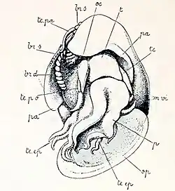 | Drawing of the ventral aspect of the animal without the shell, magnified: br.d, right gill ; br.s, left gill ; m.vi, visceral mass ; oc, right eye ; op, operculum; p;foot; pa, mantle ; t, snout ; tc, left cephalic tentacle; te.cp, epipodial tentacles; te.pa, pallial tentacle; te.p.o, post-ocular tentacle. | |