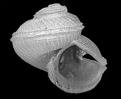 The globose-conoidal shell grows to a height of 3.5 mm. The conical spire has 3½ whorls that are a little convex. They are cancellated with radiating, subdistant lamellae, and show elevated transverse lines in the interstices. The lamellae are flexuous on the base. The aperture is subcircular. The inner lip is dilated, angular and broadly reflexed in the middle. It partly covers the umbilicus.[3][4]