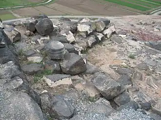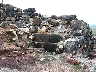 Rusa II attempted to stem the decline of Urartu but was largely unsuccessful. A new granary, mentioned in an inscription by king Rusa III, was probably the large major building works in Argištiḫinili.[7] Shortly thereafter, civilians and the army appear to have abandoned the fortress of Erebuni (at the time the main military centre in the Ararat Plain) on tactical grounds, and joined the main forces at the great fortress of Teishebiani, thereby putting Argištiḫinili at risk of attack.[4][19] Indeed, around 600 BC, this town was captured and torched. Archaeologists have discovered evidence of assault weapons, major conflagration and extensive deaths of residents. Argištiḫinili was probably destroyed by the Scythians[19][20] or the Medes,[21][22] and thus lasted fewer than 200 years.