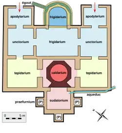 For functional reasons, the palaestra and gymnasium are typically situated near the entrance of the baths.[43]