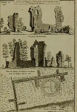 In 1688, Louis Le Vavasseur de Masseville reported the tradition of an ancient city at the site of Alleaume, mentioning the "old castle of Vallongnes,"[13] sometimes attributed to Clovis.[14][N 1] In 1695, Nicolas-Joseph Foucault, the intendant of the generalité of Caen, commissioned excavations at the site. The Jesuit Pierre-Joseph Dunod, who supervised the works, identified the ruins as an ancient bathhouse, not a castle.[A 2] However, a plan published by Bernard de Montfaucon in 1722 erroneously depicts the baths of Vieux-la-Romaine instead.[PN 2] Despite a correction by de Montfaucon, some authors, including Jean-Louis Adam in 1905, adopted the incorrect plan.[16] It was not until 1953 that Albert Grenier highlighted the importance of this correction, which had previously gone unnoticed.[17][N 2]