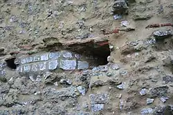 The walls are thick, with the caldarium walls reaching around 2 meters, likely for thermal insulation and roof support.[PN 5] They are constructed using rubble masonry, sandwiched between two claddings of small regular blocks (opus vittatum) of limestone rubble (12 × 12 cm), with corner reinforcements made of larger rubble of the same nature.[34] Ceramic building material (CBM) is incorporated in the arches of openings, doors, and windows[21] to ensure strength and enhance aesthetics.[PN 3] In the lower parts of the sudatorium, CBM is used alone due to its refractory qualities, in contact with the praefurnia and forming the mass of the hot pool.[F 5] The absence of CBM in alternating layers with the rubble in the facing of the walls (opus mixtum) suggests the baths were constructed before the 2nd century, a time when this architectural feature was becoming more common.[PN 4]