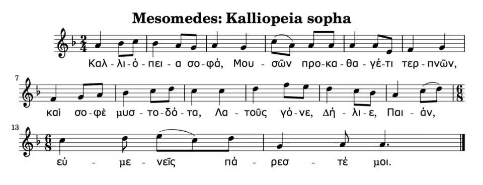 An important indication of the melodic nature of the Greek accent comes from the surviving pieces of Greek music, especially the two Delphic hymns (2nd century BC), the Seikilos epitaph (1st century AD), and the hymns of Mesomedes (2nd century AD). An example is the prayer to Calliope and Apollo written by Mesomedes, court musician to the Emperor Hadrian: