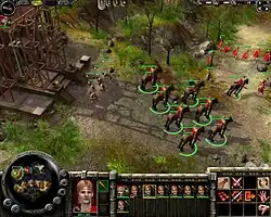 Whether playing in single-player or multiplayer mode, each game begins roughly the same way; the player is positioned at a set location on the map, usually with a prebuilt base building, and often with a certain number of soldiers and/or workers.[7] The game features three types of resource; gold, wood and food.[5] Gold and wood are required to construct buildings, research new weaponry and technologies, equip warriors with weapons and shields, and build war machines such as catapults, siege towers, and chariots. Food is required to sustain the army and workforce.[12] If food reserves drop to zero, the number of health points of all combat units begins to dwindle, eventually dropping to 10% of the maximum amount.[13] The player can acquire gold by building goldmines, wood by clearing forests, and food by constructing buildings such as farms or sending workers out to hunt.[14]
