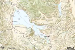 The Clear Lake Watershed is contained within the Upper Cache Creek USGS hydrologic unit, an area that encompasses 271,360 acres (109,820 ha).[9] The drainage basin is 458 square miles (1,190 km2) (526 square miles (1,360 km2) including the lake), which is large compared to the lake's 68 square miles (180 km2). The surface area of the lake is divided into three arms: the Upper Arm, the Oaks Arm and the Lower Arm.[10] Cache Creek, the only outlet for the lake, originates from the Lower Arm. Cache Creek has two major tributaries: North Fork Cache Creek and Bear Creek.[11] The Upper Arm is the largest of the three arms and receives 75% of drainage from the watershed. Rodman Slough, contained within the Upper Arm, receives drainage to its marsh from Scotts Creek and Middle Creek, the largest tributaries to Clear Lake as well as Kelsey Creek, which enters from Big Valley.[10] Erosion and sedimentation are key environmental concerns in the Clear Lake region. Seventy percent of the terrain has very shallow topsoil, which saturates after a rainfall of 3 to 4 inches (76 to 102 mm), after which runoff flows quickly into the lake. The maximum flow from the lake is determined by the narrow canyon of Cache Creek, not by the dam. The combination of rapid inflow and slow outflow results in frequent flooding of low-elevation areas such as downtown Clearlake and Lakeport.[12][13][14]
