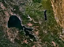 Satellite photo of Clear Lake (the larger lake to the west) and Indian Valley Reservoir