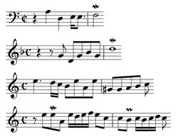 Many of the pieces are notable for their consistent employment of imitative counterpoint: for example, the Fugue grave of the third mass is fully imitative, a strict four-voice fugue, and even the passacaglia begins with an imitative passage. Other notable pieces include Gloria: Tu solus altissimus from the Messe du Sixième ton, which is a Cromorne-Cornet dialogue alternating between 3/4 and common time, and Autre Kyrie from Messe du Première ton, which is a five-voice piece. Willi Apel describes the overall style thus: "In their melodious, dance-like character these pieces follow Lebègue; others of a more organ-like and ecclesiastic approach are similar to Nivers'."[8] An interesting feature, indicative of Raison's meticulous attention to detail,[4] is the early use of double dotting in French music of the period.
