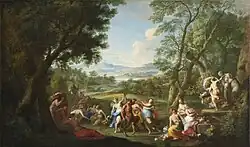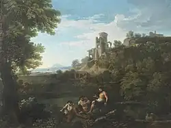 Early in his career, Locatelli specialized in romantic notions of the Latium countryside, frequently including improvised architectural elements of columns or buildings. Very few of these are thought to have been actual structures, although some were based on scenes along the Tiber and a well-known view of the Piazza Navona.[5] In later years he leaned more to "grassy ruins" and countryside expanded with trees, peasants and farm animals being more prominent.[6] Prior to about 1725, his works were considered "ruddy" in tone. A typical composition would contain figures of people or animals in the foreground with buildings in the midground and mountains or water in the distance. Balancing this horizontal pattern were vertical elements of buildings, columns and trees – especially large oaks or ilex rising up from the foreground. A frequent feature is the presence of broken trees or stumps and Mediterranean shrubbery.[7]