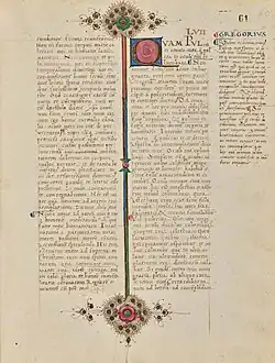 Its cover (1 recto) is highly decorated: all four sides are surrounded by flowers and leaves. On the right edge there are miniatures in two medallions. The top miniature depicts an angel wearing a green robe and holding a crown. The lower miniature depicts a Carthusian monk with gentle features, the author himself, Andreas Pannonius, holding a book bound in red leather (i.e. the work itself). The central initial "S" on the cover depicts Matthias Corvinus, the angel and the monk both extend the crown and the work towards him, respectively. The depiction of Matthias is very different from the images created by his contemporaries and those created in the king's environment: it is clear that the illustrator was not familiar with the king's appearance, so he used his imagination to depict a ruler similar to Italian princely figures (e.g. clothing).[49] Most of the art historians – e.g. Ilona Berkovits, Konrad Oberhuber and Dániel Pócs – identified the illustrator with Early renaissance manuscript illuminator Guglielmo Giraldi, who was active in Ferrara in those years.[50] Outside the cover, Andreas' work is decorated with only a few initials.[49] Another folio (60 verso) depicts a divina iustitia miniature in initial "A".[51]