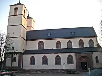 The church's windows were replaced with Gothic style ones after a fire in 1200. The humanist Peter Anton von Clapis became its provost in 1470. The church and monastery were destroyed in 1689 during the Nine Years' War and only restored in 1761.
