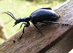 Females of the parasitic strepsipteran Stylops melittae specialise in parasitising mining bees producing large numbers of larvae on flowers. When the bee forages on the flower for pollen, the larvae attach themselves to the bee. Then, when the bee provisions a nest cell, one or more larval Strepsiptera enter into the larval bee's body and settle in its abdomen. After the larval bee matures, the strepsipteran larvae break through between two of the bee's abdominal segments, pupate while lodged within the host's abdomen, and then the males emerge as imagos and fly off to mate with virgin, still host-resident, females (i.e., the adult females—which have no wings, antennae, or even eyes—never leave the host). Female Strepsiptera release live young when the parasitized bee forages. The larval Strepsiptera must find their own host to begin the life cycle again.[2] In a study on Öland three species of flies were observed at or near the nest entrances of A. scotica or around flowers upon which the female bees were foraging. These were the Conopid Myopa buccata, the bee fly Bombylius major and anthomyiid Leucophora personata. In addition, Myopa testacea, was also recorded as a parasite from sampled A. scotica. Other insects associated with the nests A. scotica include the cuckoo bee Nomada marshamella and the violet oil beetle (Meloe violaceus), the larvae of which attach themselves to foraging bees when they land on flowers and are transported by the bee into the cell where the consume the contents of the cell, including the eggs of the bee.[9]