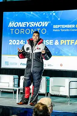 ![]() Andrew Aziz presenting in a climbing suit at MoneyShow, Toronto in 2023 | |||||||
