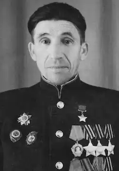 Soon after the start of the German invasion of the Soviet Union, he was soon re-drafted into the Red Army on 4 July 1941 and initially deployed to the front as part of the 50th Cavalry Regiment. There, he participated in the defense of Moscow. Later he became the commander of the gun crew in the 175th Guards Artillery and Mortar Regiment of the 4th Guards Cavalry Division. During the battles for Seredina-Buda in March 1943, his crew took out three enemy tanks from a group of ten during the battle, for which he received his first military medal, the medal "for battle merit". However, it was not until 11 August 1944 that he was awarded an Order of Glory, which he received for his actions on the night of 26 July 1944 when he pushed his gun ahead of the battle formation and opened fire on enemy machine gunners to repulse their attack. The next day he participated in the destruction of an ammunition depot. Subsequently, he was awarded another Order of Glory 3rd class for his actions repelling repeated enemy counterattacks during 28–30 January 1945. On the first day he killed at least ten enemy soldiers with his machine gun, and by 30 January he and his crew took out an additional 20 enemy soldiers plus two machine gun nests. Just a few days later on 5 February while advancing with his crew in an area southwest of Szczecin, Poland, he became the first to open fire on the enemy despite being under intense fire, resulting in the deaths of 52 enemy soldiers in the engagement. For his actions in that battle he was nominated for the title Hero of the Soviet Union, which was awarded on 31 May 1945. Before being awarded the title, in early May he again distinguished himself in the battle for Neu, southwest of Fürstenwalde, during which he and his crew repulsed three counterattacks, taking out an enemy platoon. For his actions in that battle he was awarded another Order of Glory in June.[a][1][2]