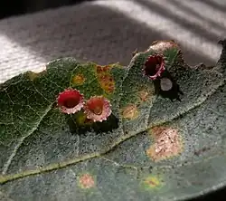 Feron gigas, also known as the saucer gall wasp, is a species of gall-forming wasp in the genus Feron.[1][2] It induces galls on the leaves of scrub oaks, blue oaks, and Engelmann oaks. The galls produced by its all-female generation, which emerges in winter, are 3-4 mm wide, circular with raised edges. They are red, pink, brown, or purple. The larval chamber exists as a raised bump in the gall's center. The bisexual generation produces galls that are brown and cone-shaped.[3]