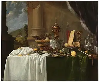 - ^ Andries de Coninck, An elaborate still life with a lobster, sweetmeat pie, oysters, fruit, and a blue and white wanli bowl, a partly filled tall, glass flagon of wine, a silver pokal and silver jug, all arranged on a draped table, a view of the countryside through a window behind at Sotheby's