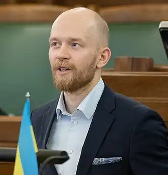 He was elected to the 14th Saeima from the Progressives list on October 1, 2022.[9] On April 29, 2023, he was elected as the co-chairman of the Progressives (together with Riga City Council deputy Justīne Panteļējeva).[10]
