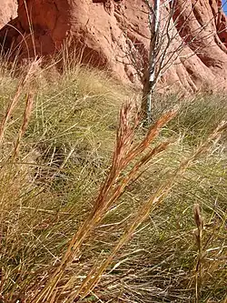 This grass reaches heights approaching two meters (6 feet) and has large, fluffy cream-colored inflorescences.[4] Each dense, tufted inflorescence has several pairs of hairy spikelets. The leaves may reach over a meter in length and are typically blue-green in the summer and coppery-red in the fall.[2]