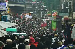 Beginning in January 2009, Andry Rajoelina led a series of political rallies in downtown Antananarivo. On 13 January, he launched an ultimatum to the government to restore Viva TV. A week later, the transmission failure message of Viva TV was changed to a still picture of Andry Rajoelina, which led the authorities to seize the channel's transmitter by force.[15] On 17 January, Andry Rajoelina gathered 30,000 supporters at a public park which he renamed Place de la Démocratie to defy the public executive power of Ravalomanana.[17] At a rally on 31 January 2009, Rajoelina announced that he was in charge of the country's affairs, declaring: "Since the president and the government have not assumed their responsibilities, I therefore proclaim that I will run all national affairs as of today." He added that a request for President Ravalomanana to formally resign would shortly be filed with the Parliament of Madagascar.[18] This self-declaration of power discredited Rajoelina's democratic aims, and the number of attendees at subsequent rallies declined, averaging around 3,000 to 5,000 participants.[17]