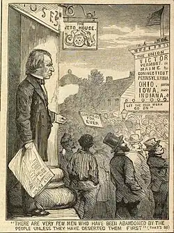 "This gang of office-holders, these bloodsuckers and cormorants had got fat on the country." | This comment was made during Johnson's Cincinnati speech at Kennard House.[13] In seeking to use patronage jobs and the spoils system to his own benefit, Johnson "removed 1283 postmasters and made similar decapitations in the custom-houses and internal revenue offices". However many of these jobs had gone to injured war veterans during the Lincoln administration, while Johnson hired "men who opposed the war throughout", which caused its own set of political problems.[14] In one case, according to a Delaware paper, a "good union man" was replaced as a railroad mail agent by Joseph Bush, said to be a former slave trader and Confederate sympathizer; the newspaper sarcastically commented, "This is the way President Johnson makes treason odious."[15] |