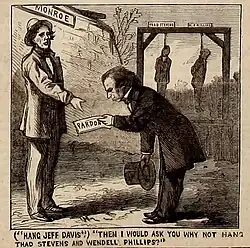 ("Hang Jeff Davis.") "Then I would ask you, why not hang Thad Stevens and Wendell Philips." | Nast is quoting from an exchange between the crowd and Johnson at Cleveland. Among other things Unionists had spent the better part of the war singing "Oh we'll hang Jeff Davis from a sour apple tree." Rather than offering them any satisfaction, Johnson returned to a theme he'd hit for years: that abolitionists and secessionists were equally pernicious forces for disunion.[23] (Ergo, Jefferson Davis, Thaddeus Stevens, and Wendell Phillips were all equally deserving of capital punishment for treason.) He had been making similar statements for years; for example on the Fourth of July 1862, he told a crowd at the Tennessee State Capitol in Nashville, "The Abolitionist and Secessionists on this point occupy the same stand: there is no difference between them. The Abolitionists, such as Wendell Phillips Garrison, and others, denounce President Lincoln as one worse than Jeff. Davis: From the hands of these incendiaries on both sides the people must rescue the Union. There is a great middle party between these two extremes." |