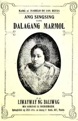 Ang Singsing nang Dalagang Marmol ("The Ring of the Marble Maiden"[1]), contemporarily rendered as Ang Singsing ng Dalagang Marmol in the Tagalog language, is a historical novel written by Filipino novelist, scholar, and labor leader Isabelo Florentino de los Reyes (also known as Isabelo de los Reyes, Sr.) before 1905. It is one of the first historical novels written in the Philippines during the first decade of the 20th century (1900 to 1910).[1][2] It was also one of the first novels during the period that was written using the technique of blending fact and fiction.[2] Through the novel, De los Reyes revealed his knowledge of the actual events during the Philippine–American War, making the subject as "integral elements" of the book.[2] Based on the original 1912 bookcover for the novel, Ang Singsing ng Dalagang Marmol is alternatively titled Si Liwayway ng Baliwag ("Liwayway of Baliwag").[3]