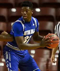 Delgado broke Derrick Coleman's record for most rebounds in the Big East with a 19-rebound performance against DePaul on January 27, 2018.[7] In his final game in college, an 83–79 loss to Kansas in the Round of 32 of the NCAA Tournament, he had 24 points and 23 rebounds.[8] As a senior, Delgado averaged 13.6 points, 11.8 rebounds and 2.8 assists per game. He won the Kareem Abdul-Jabbar Award for top center and Haggerty Award for top New York-area player.[9] In his career at Seton Hall he pulled down 1,432 rebounds. He participated in the 2018 Portsmouth Invitational Tournament.[10]